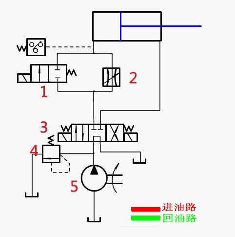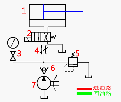 油路說明:在進油管路上設置節流閥,控制液壓油流量,進而控制活塞桿移動速度